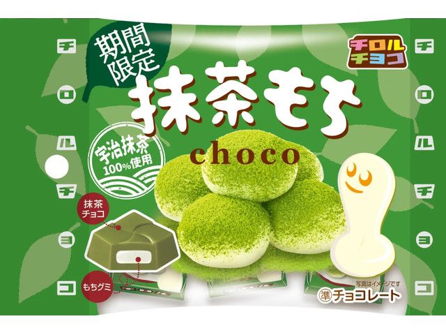 抹茶チョコは宇治抹茶100%使用(抹茶原中に占める割合)し、抹茶本来の旨味とほどよい苦みを楽しむことができます。センターにもちグミを入れることで、何度もお口の中でもちもち食感を楽しむことができ、抹茶の旨味をゆっくり味わうことができます。パッケージは濃い緑色で抹茶を表現しチロルチョコのもちシリーズで人気のキャラクター「もちくん」が登場!