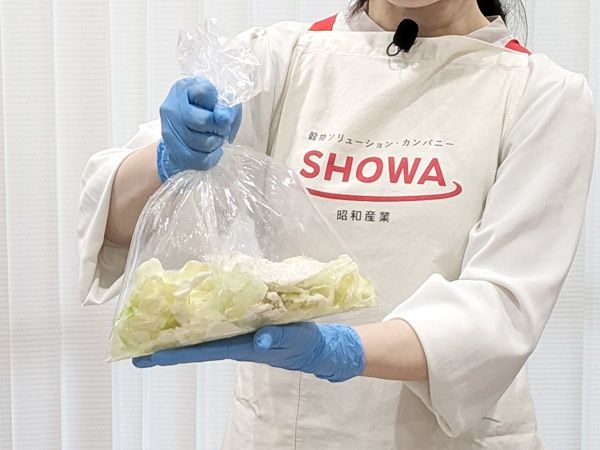 1.カット野菜と水、このお好みーるを袋に入れて、空気を入れて振ります。