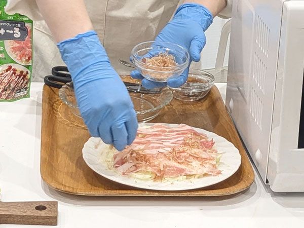 このときは、豚バラと鰹節をトッピングに。加熱前に鰹節をプラスすることで、加熱後レンジを開けたときに香りが広がります。