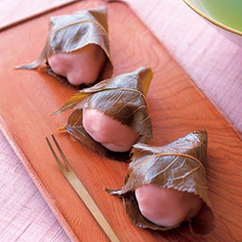 御菓子司 鶴屋寿の桜餅は、やや小ぶりなサイズの一品。春だけでなく一年中楽しめるよう、あえて桜色に染めず、道明寺本来の色を生かしたやさしい白色に仕上げている。さらに、塩漬けした伊豆・大島桜の葉を2枚で挟んでいるのも特長だ。桜の葉の香りと程良い塩気が、上品なこしあんやもちもちとした道明寺と合う。包みも美しく、贈り物にも喜ばれそうだ。