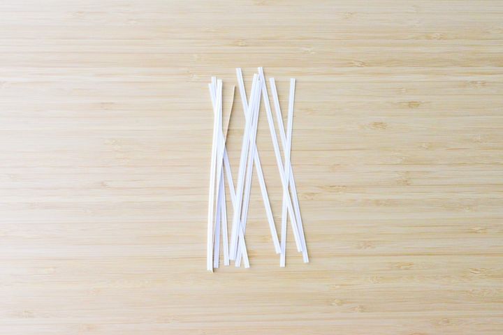 蛇腹折りをし、中心をビニタイで留めた束の両端を三角にカットすると……