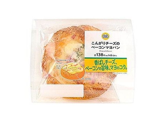 チーズの香ばしさとベーコンの旨味、マヨネーズのコクが楽しめる惣菜パンです。チーズパウダーをつけた生地に、短冊ベーコンとシュレッドチーズ、チーズ入りマヨネーズ、パセリをトッピングして焼き上げました。