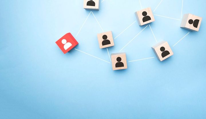 Diverse group of people standing in front of interconnected network of individuals, representing teamwork and collaboration