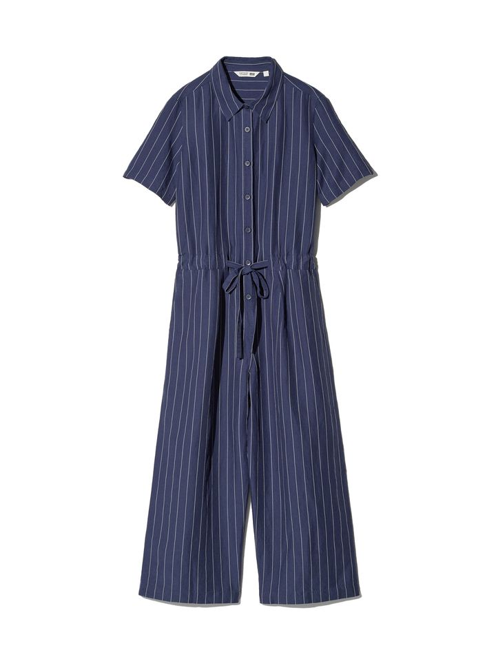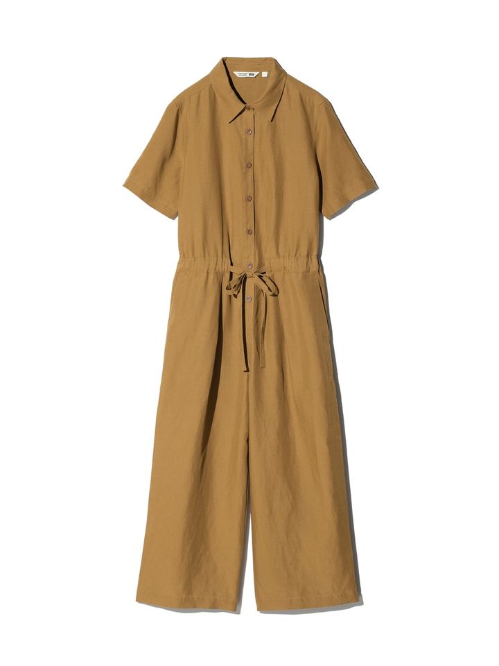 そのなかで編集部が特に注目しているのは、一枚で着こなしがキマるリネンブレンドジャンプスーツ。上品なドレープ感を生み出すリネン混の素材は、着心地も抜群。ワイドストレートなシルエットは、ウエストのバッックサイドはゴム仕様、前は紐付きで調整可能。フロントボタンを開けてインナーをチラ見せしたりなど、レイヤードで差をつけても◎。
