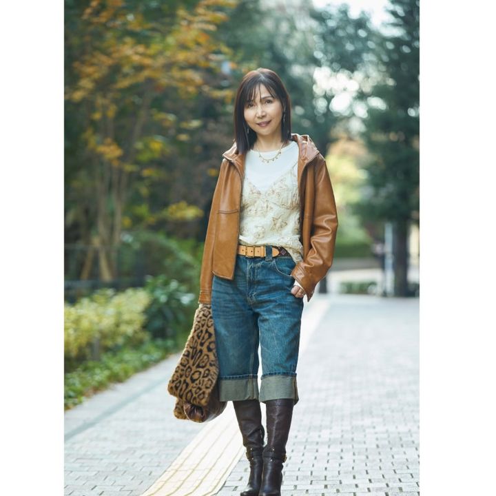 3. 【60代ファッションスナップ】ロングブーツとレザージャケットでハンサムに仕上げた、大人のハーフデニムパンツコーデ【ZARA】