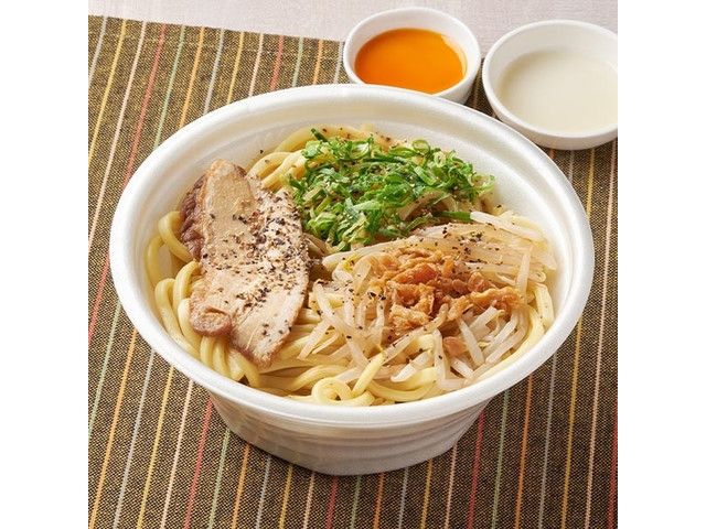タレが良く絡む太麺に、醤油ベースのタレを合わせた油そばです。具材としてチャーシュー・青ねぎ・もやしをのせ、味のアクセントにフライドオニオンや黒コショウをトッピングしたスパイシーな味わいが特徴です。 ※宮崎県、鹿児島県では取り扱いがございません。