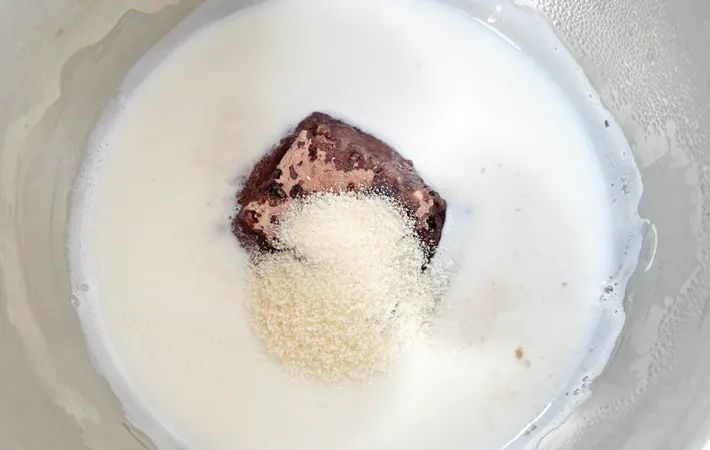 まず、牛乳と『森永 おしるこフリーズドライ』を鍋に入れ火にかけます。