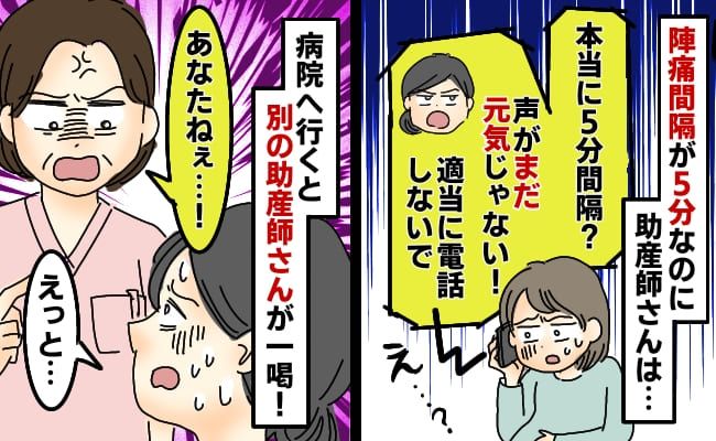 病院に診察を断られてから丸1日がたったころ、痛みは引くことなく、5分間隔になりました。「これなら病院に行ってもいいはず」と思ってもう一度病院に電話してみると、昨日と同じ助産師さんが出て、「昨日も連絡くれた方よね? 本当に5分間隔なの? 声がまだまだ元気じゃないの。適当に連絡してこないでくれる?」と冷たくあしらわれてしまったのです……。痛みと闘いながらどうすればいいのかわからなくなっていたところ、他の助産師さんが電話を変わってくれ「5分間隔なのよね? 一度おいで。先生に診察してもらおうね」と言ってくれました。