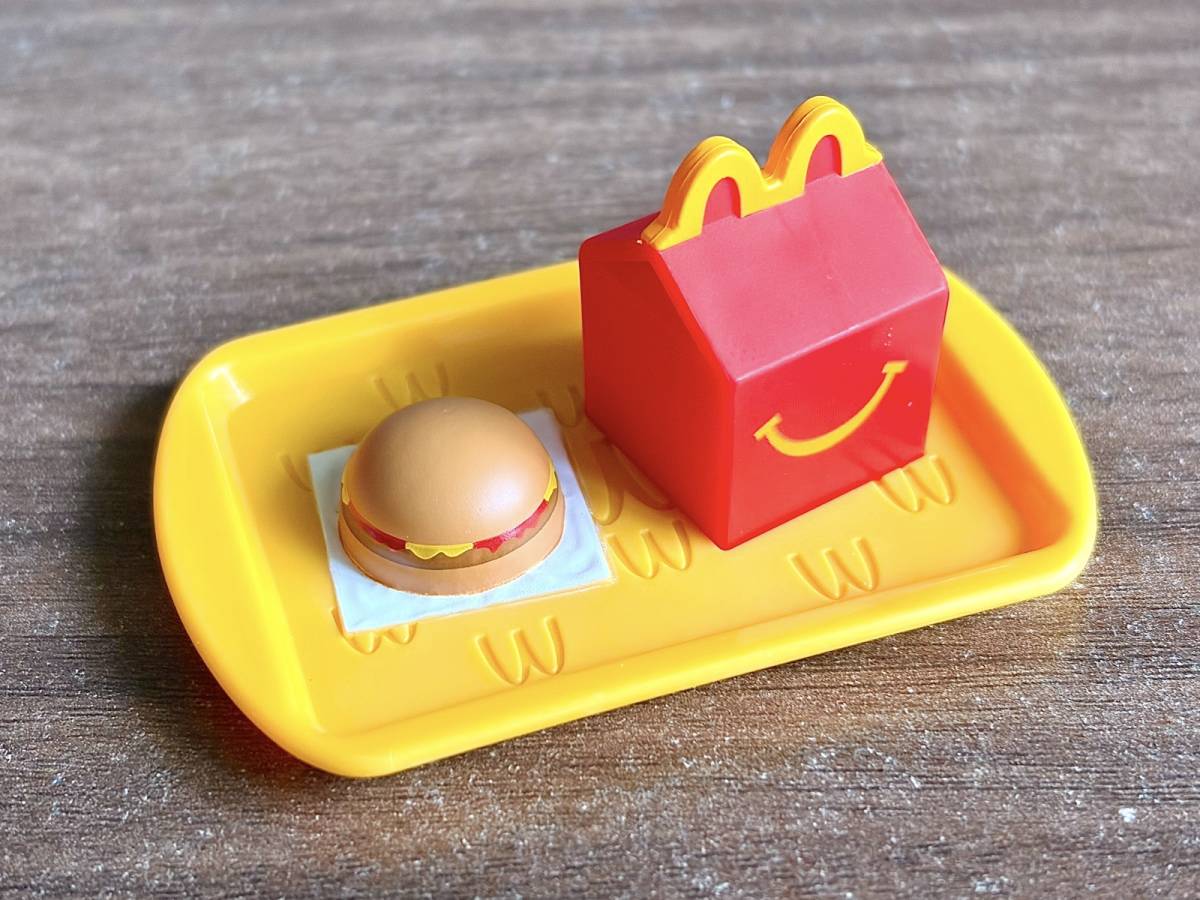ハッピーセットボックスとハンバーガーがのったトレイのおもちゃ。