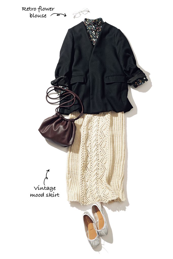 ノーカラージャケットでアクをそぎ、なつかしさのある柄&ニットをすっきりと。スカートのやさしげなムードと波長が合うのも、しなやか素材のミニマルなジャケットならでは。