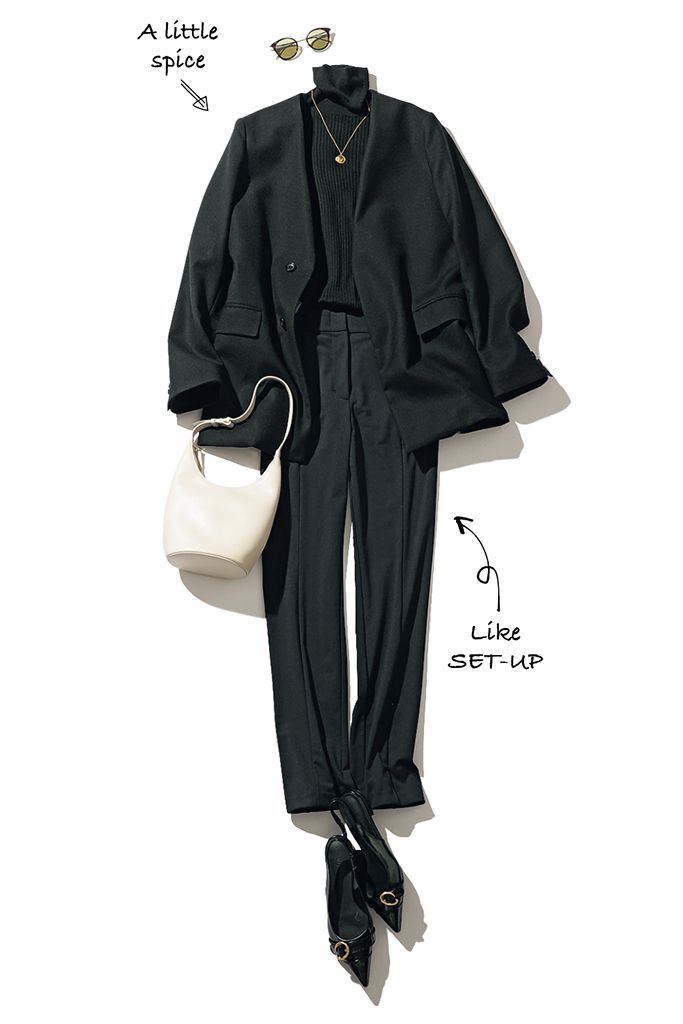 ワードローブの軸となる細身の黒を組み合わせて、ワークシーンに向くまじめな面持ちに。隙のない装いは、タートルネックをくしゅっとさせて、さりげなくニュアンスづけを。ゴールドのネックレスをたらして黒一色の単調さを払拭。