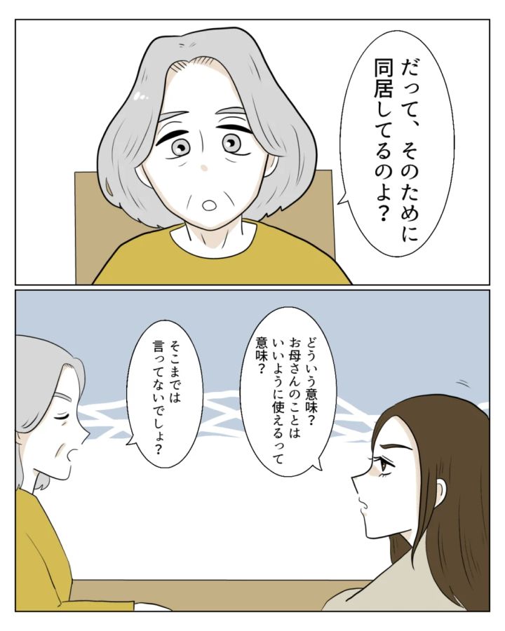 「だって、そのために同居しているのよ?」嫁は自分のお世話をするのが当然と思っているようでした。真矢は少しイラつきながらも「どういう意味?お母さんのことはいいように使えるって意味?」と聞き返します。祖母は「そこまでは言っていないでしょ?」と言うものの分が悪いと感じたのか