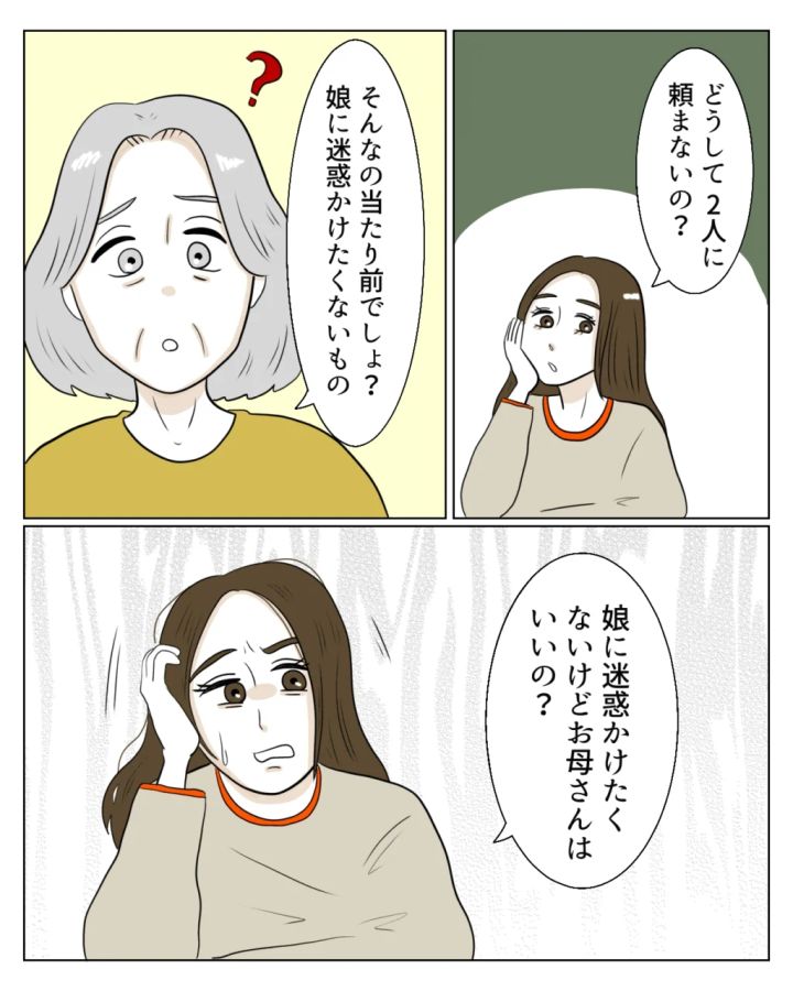 「そんなの当たり前でしょ?娘に迷惑をかけたくないもの。」と平然と言い放ちます。「娘に迷惑かけたくないけどお母さんにはいいの?」衝撃的な言葉に娘の真矢が聞き返すと、