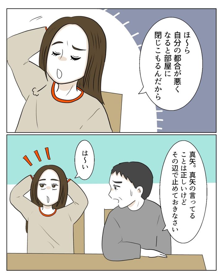 「ほーら。自分の都合が悪くなるとすぐ部屋に閉じこもるんだから。」真矢は自分の母親がそんな扱いを受けていることがいやなのでハッキリいってくれたんだと思います。夫もそこは理解してくれているようですが「言っていることは正しいけれど、その辺で止めておきなさい。」とやんわり止めていました。