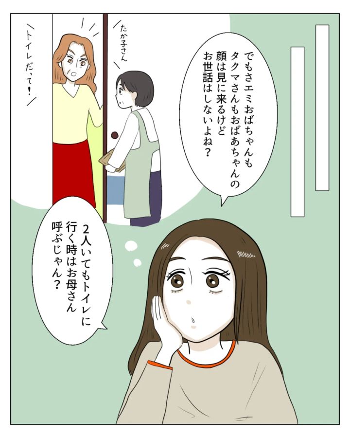 私がいないタイミングで娘の真矢は義母に今まで思っていた疑問をぶつけました。「エミおばちゃんもタクマさんも顔を見に来るけど、お世話はしないよね?2人がいてもトイレに行く時はお母さんを呼ぶじゃん?」その言葉に義母は、