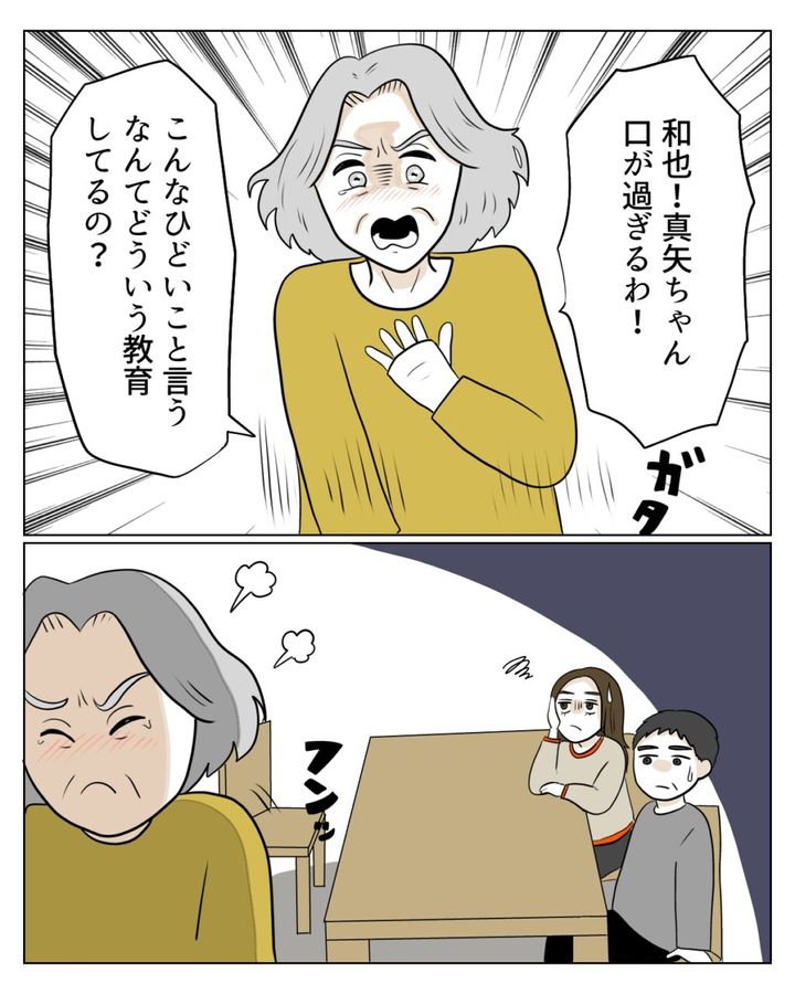 夫に「和也!真矢ちゃんが口が過ぎるわ!こんなひどいこと言うなんてどんな教育をしているの!?」と怒って自分の部屋に閉じこもってしまいました。