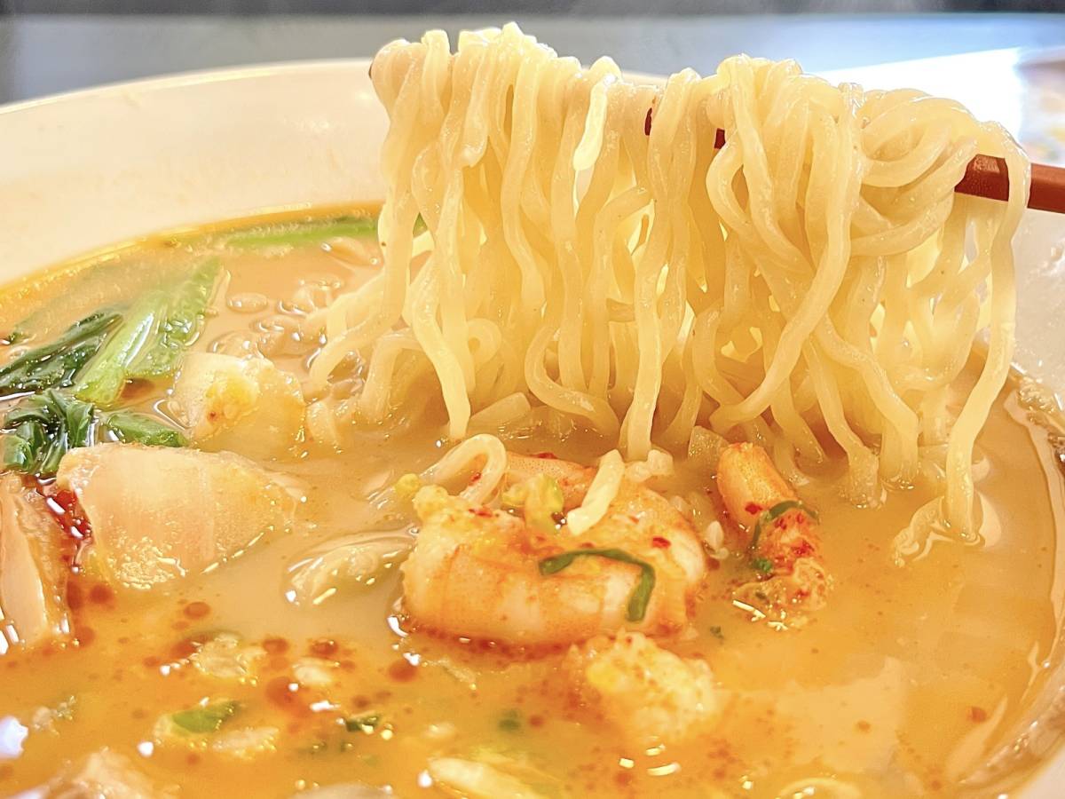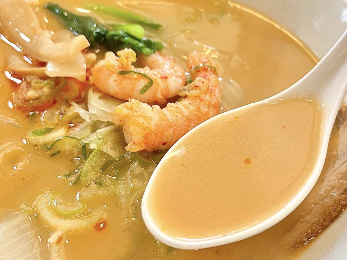 注目のエビ味噌とんこつスープは、ややライトな口当たりと濃厚な風味が◎