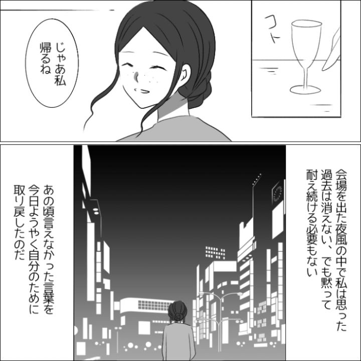 当時は言えなかった一言をいじめっ子たちに言うことができた主人公は少しだけスカッとした気持ちで帰宅できたのでした。