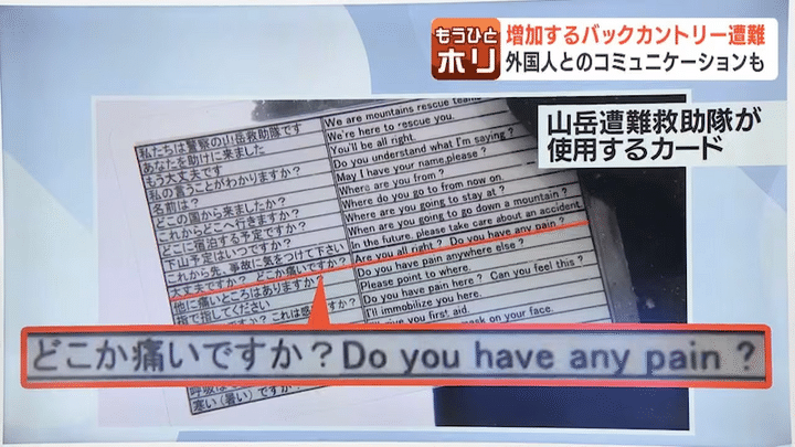 スマートフォンなどの翻訳アプリもありますが、冬山ではバッテリーが切れたり、電波が届かなかったりするときに備えて、カードを持ち歩いています。これは隊員が自ら提案して、手作りしたものだそうです。