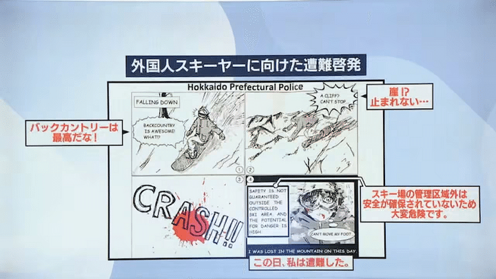 バックカントリーで遭難するのは8割が外国人というデータもあります。道警は、コミュニケーションをとるためにさまざまなツールを用意しています。