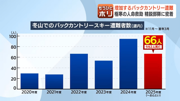 道内のバックカントリースキーによる遭難者数は、2020年からの5年間で増加傾向にあります。 今シーズンはすでに66人が遭難、このうち2人が死亡しています。