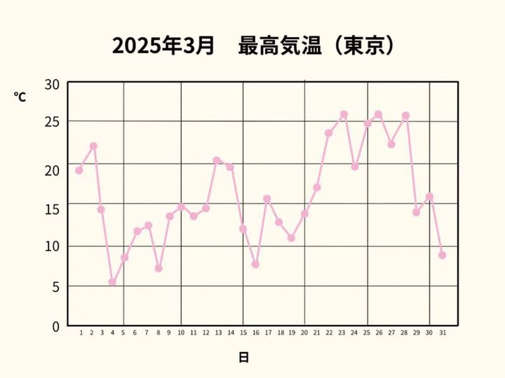 3月は寒暖差が大きく、冬の寒さと春の暖かさが短期間で入れ替わるのが特徴。昨年は下旬に夏日(25℃)が続き、上旬との気温差が20℃に。