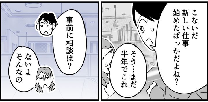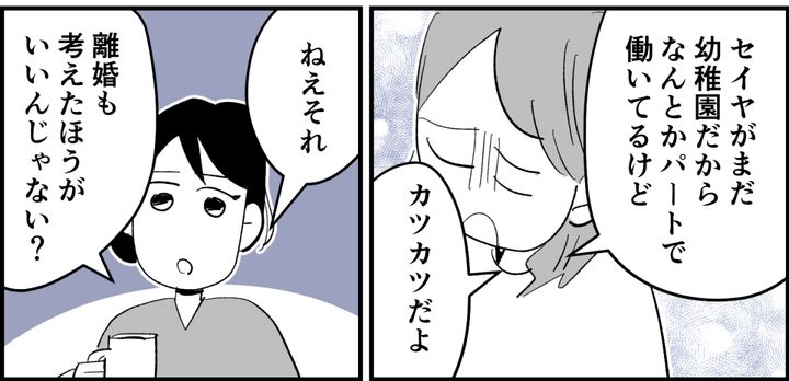 当たり前のことですが、仕事を辞めたトシハルは朝から家にいます。子どもたちが家を出たあとも、いつまでも寝ているトシハル。それを見て本当に嫌になった私は、友だちのナツコをファミレスに呼び出し、家を出ました。ナツコは学生時代の友だちで、私の悩みにいつも的確なアドバイスをくれます。