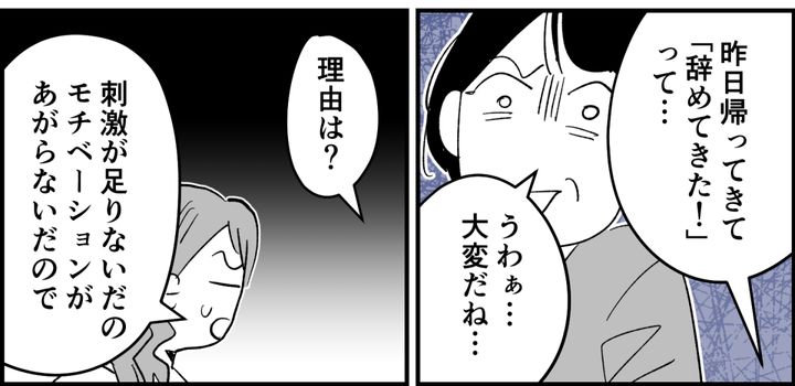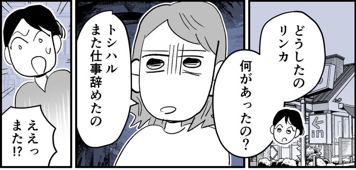 私はリンカ。夕食の支度中に夫トシハルが帰宅。いきなり「会社辞めてきちゃった!」と悪びれもせず言い出しました。これには私も怒りが爆発。というのも、相談もなしに突然辞めるのは、今回が初めてではないのです。今回の職場は順調そうだったのに、「モチベーションが上がらない」といつもの言い訳。刺激がないのは安定してるってことなのに……。貯金もないのに無駄遣いばかりして、仕事の続かないトシハルにはもううんざりです。こんな生活耐えられません。