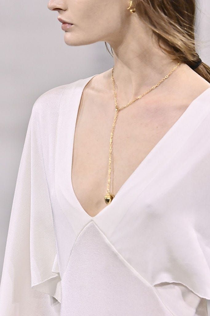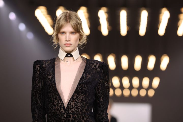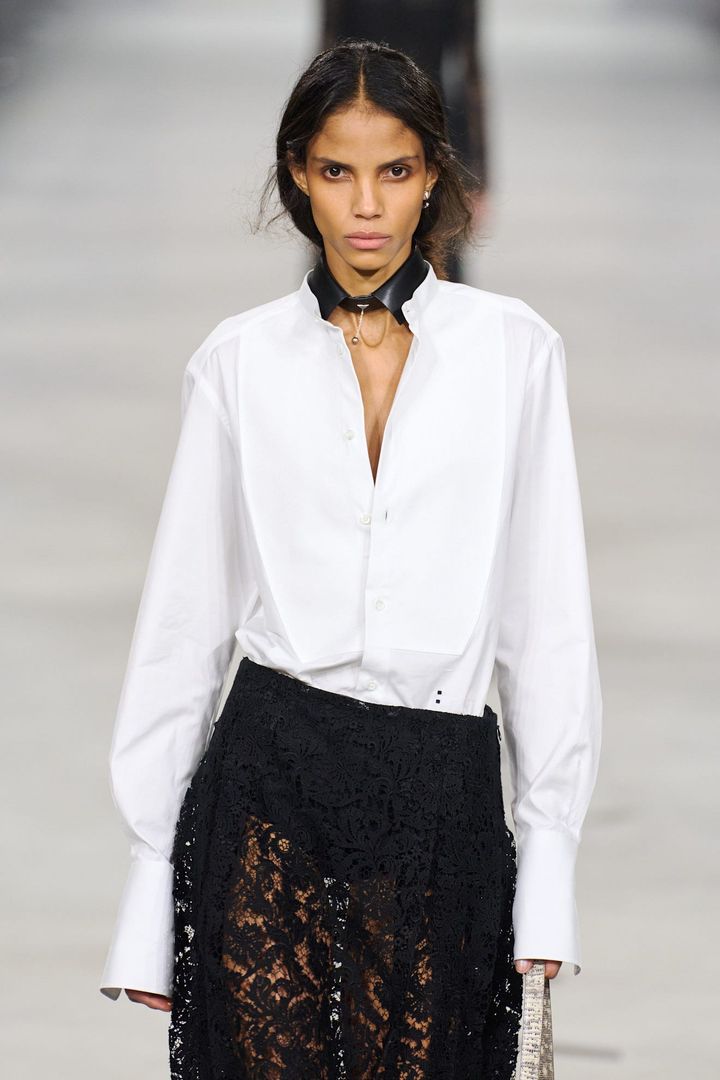 ランジェリーを思わせるスリップドレスや繊細なレース、シアーなブラックシルクがデコルテを大胆に際立たせる一方で、柔らかなテーラリングが身体を優しく包み込む。彼女が今季、もう一つの軸として掲げたのが“身体”への立ち返りだ。衣服は身体を制限するのではなく、受け入れ、寄り添い、触覚的に可視化する存在であるべきだという提案である。レースの透け感、流動的なフォルム、レザーのチョーカーが首元に描く緊張感は装飾を超えて、感覚のレイヤーとして重ねられていた。