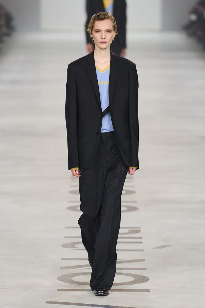 ブラックとミッドナイトブルーを基調に、グレーとレッド、少しのイエローを差し込んだ徹底して沈静的なカラーパレット。視覚的な刺激よりも、質感と構築にフォーカスする姿勢が明確だった。中盤以降はミリタリーからウエスタン、フォークロア、ストリートまで異なるスタイルを縦横無尽に掛け合わせながら、主軸となった厳粛なテーラリングとコントラストを成す。