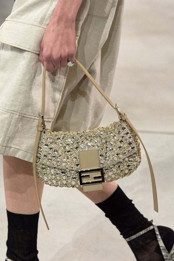これまで数々のitバッグを世に送り出してきたキウリにとって、アクセサリーはやはり真骨頂だ。90年代、彼女が最初に「フェンディ」に在籍していた時代に誕生したアイコンバッグ“バゲット”は、ダブルバックル仕様で再構築され、時にサイケデリックな色彩で圧倒的な存在感を放つ。脇に抱えることも、クロスボディで掛けることもできる自由さは、まさに“私たち”の時代のバッグ。