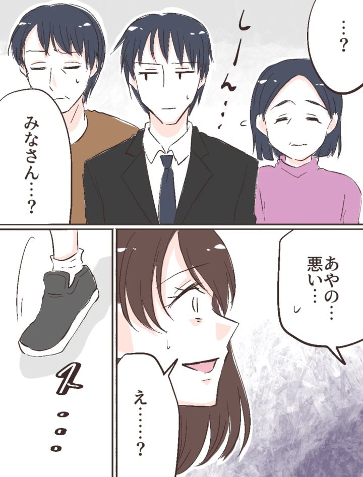 3人は静まり返り、どこか気まずそうな表情を浮かべます。なんだか様子がおかしい。嫌な予感が胸をよぎり、「みなさん・・・?」と恐る恐る声をかけました。すると修吾が申し訳なさそうに視線を落とし、「あやの、悪い」と口を開きます。「え?」と戸惑っていると、私の視界に人影が入り込んできました。