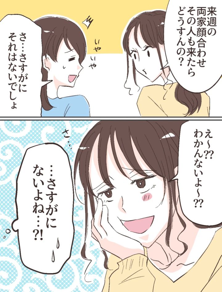 「来週の両家顔合わせ、その人も来たらどうすんの?」ふみのにそう言われ、私は「さ、さすがにそれはないでしょ」と首を振りました。しかし、ふみのは面白がるように「え~?わかんないよ~?」と意味深な笑みを向けてきます。智美さんが両家顔合わせにまで来るなんて、さすがにありえない。私はふみのの言葉に嫌な予感を覚えつつも、それを無理やり振り払いました。