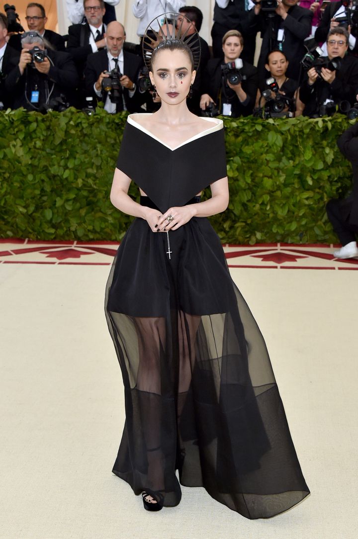彼がこの世を去って2カ月後の2018年のMETガラでは、リリーは同ブランドのクチュールのドレスをまとい、亡きデザイナーへのオマージュを捧げた。そこに、テーマである『天国のボディ:ファッションとカトリックのイマジネーション』にふさわしい、後光のようなヘッドピースと十字架のペンダントを手にしていた。