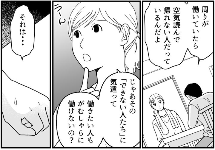 夫は他人の働き方を気にして、自分ごとに捉えてしまうタイプなのでしょう。周りが働いていたら、空気を読んでしまって帰れないのです。だから「気を遣わなくてもいい雰囲気の社会であってほしい」と求めてしまうのかもしれません。