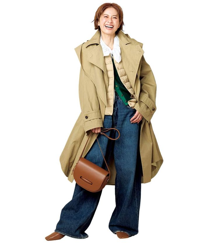 ウールコートで冬を引きずりたくない日は羽織るだけで一気に春めくトレンチを投入。ポイントは薄手 & 淡色のダウンをレイヤードし、見た目の春っぽさと暖かさを両立させること。丈が長めのものを選べば防寒にも一役。