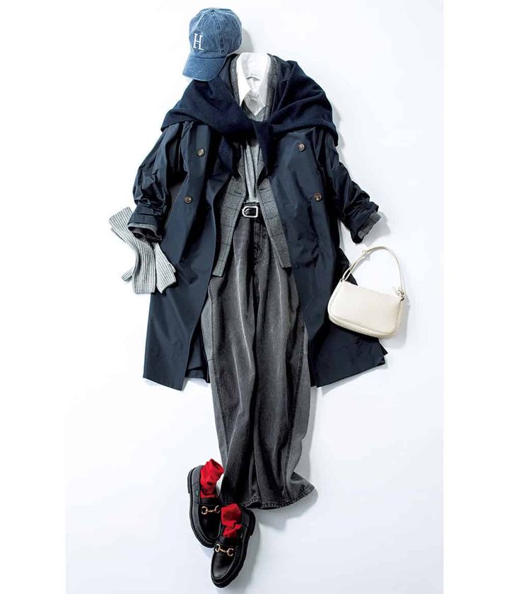 撥水トレンチコート¥132,000(デパリエ 伊勢丹新宿店)ジャケット¥37,400(ミースロエ/ミースロエ ルミネ新宿1店)ニット¥18,700シャツ¥20,900(ともにブロッサム)デニム¥17,930(メゾンスペシャル 青山店)バッグ¥33,000 (ヴァジック/ヴァジックジャパン)シューズ¥96,800(パラブーツ 青山店)ベルト¥52,800(デアンシェ/エスアンドティ)キャップ¥6,490(ヘルシーデニム/ゲストリスト)ストール¥4,990(アンフィーロ)アームウォーマー¥18,700 (アソース メレ/アイネックス)ソックス(スタイリスト私物)