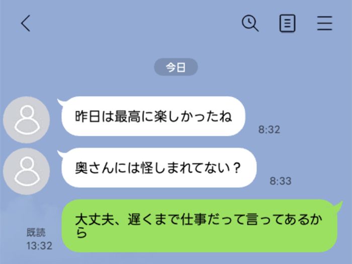 「昨日は最高に楽しかったね」「奥さんには怪しまれてない?」