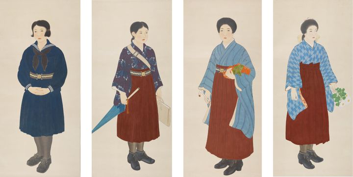 (坂内青嵐 「東京女子高等師範学校附属高等女学校生徒服装の変遷」 八幅のうち四幅 昭和9年(1934)頃/お茶の水女子大学蔵)