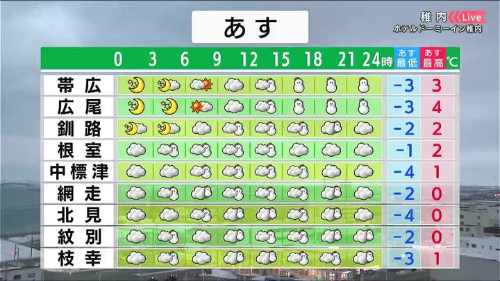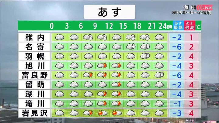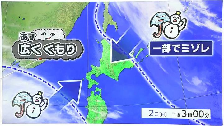 稚内は朝から雪が降りやすく、うっすら積もるでしょう。旭川や岩見沢は日中、晴れ間がある見込みです。最高気温はきょう2日(月)より2度ほど高くなります。