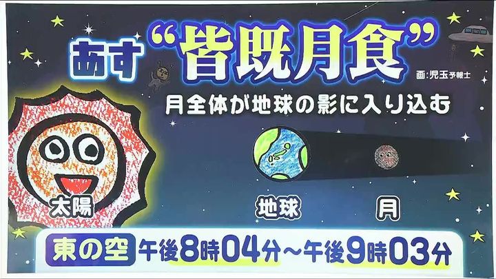太陽と地球と月が一直線に並んで、月全体が地球の影に入り込むことで、月全体が暗く見える現象です。あす午後8時頃から東の空で皆既月食が始まります。