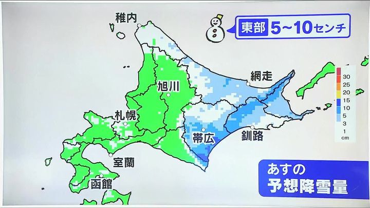 東部で天気が崩れ、広く水色、5センチくらいの雪が降るでしょう。広尾町など十勝南部は濃い青色で、多いところで10センチくらいです。湿った雪が降るため、路面状況の変化などに注意して下さい。札幌は雪の量は少ないでしょう。