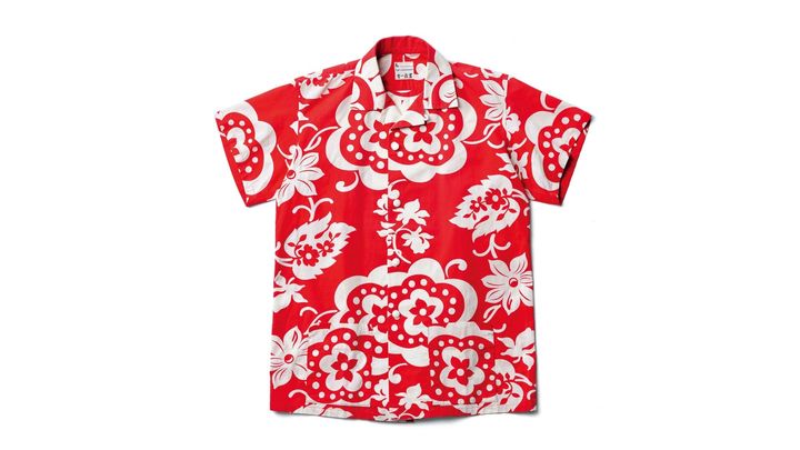 映画『狂った果実』(1956年)のアロハシャツ。俳優の石原裕次郎、津川雅彦、岡田眞澄の衣装を、女性物のプリント柄生地で仕立てた。 1956年 所蔵=島根県立石見美術館 撮影=小川真輝