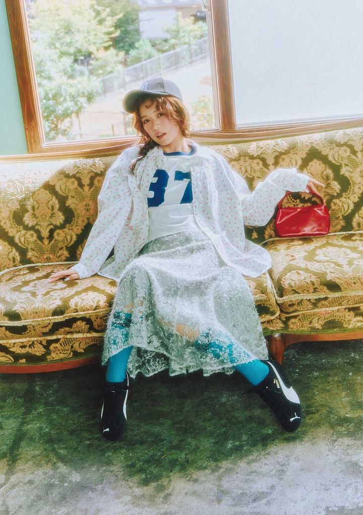 審良ふたば。ar1月号より ローズブローチ付きシャツ¥17,600/ガールズソサエティ Tシャツ¥48,400/ユハン ワン(レイ ビームス 新宿) スカート¥20,800 /スナイデル(スナイデル ルミネ新宿2店) キャップ¥5,995/マウジー(バロックジャパンリ ミテッド) バッグ¥9,900/テュオ(ユー バイ スピック& スパン ルミネ池袋店) ヘアピン¥1,375/アネモネ(サンポークリエイト) ソックス¥2,145/ビームス ボーイ(ビームス ボーイ 原宿) シューズ¥15,400/プーマ(プーマ お客様サービス)