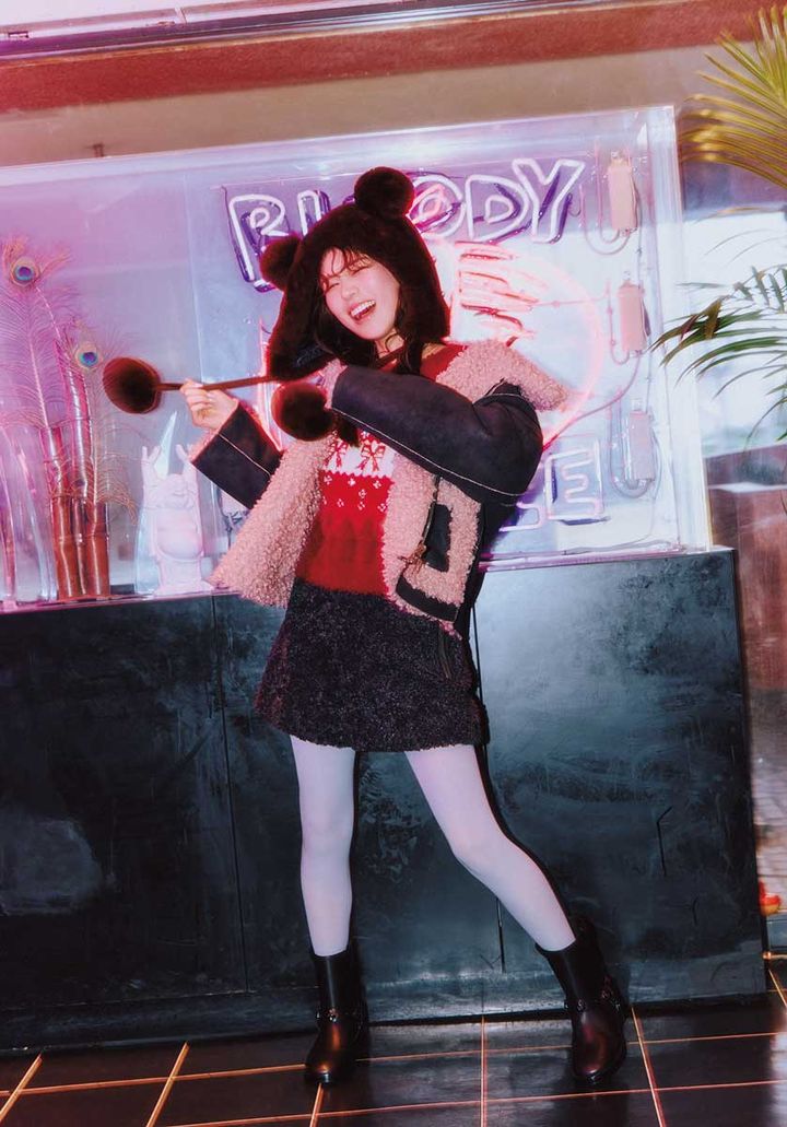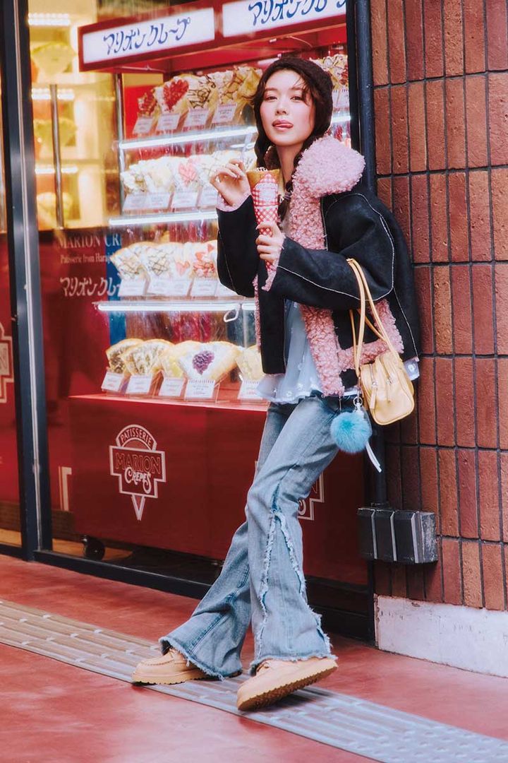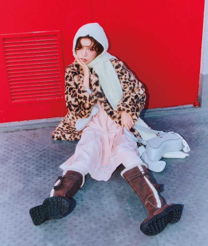 冷える日には、ボアコート&くまちゃん帽でしっかり防寒しつつ、脱いだら主人公級の派手さを放つニットをこっそりON。アウターのボアを添えて、パンツももこもこ質感で揃えて統一感を。」