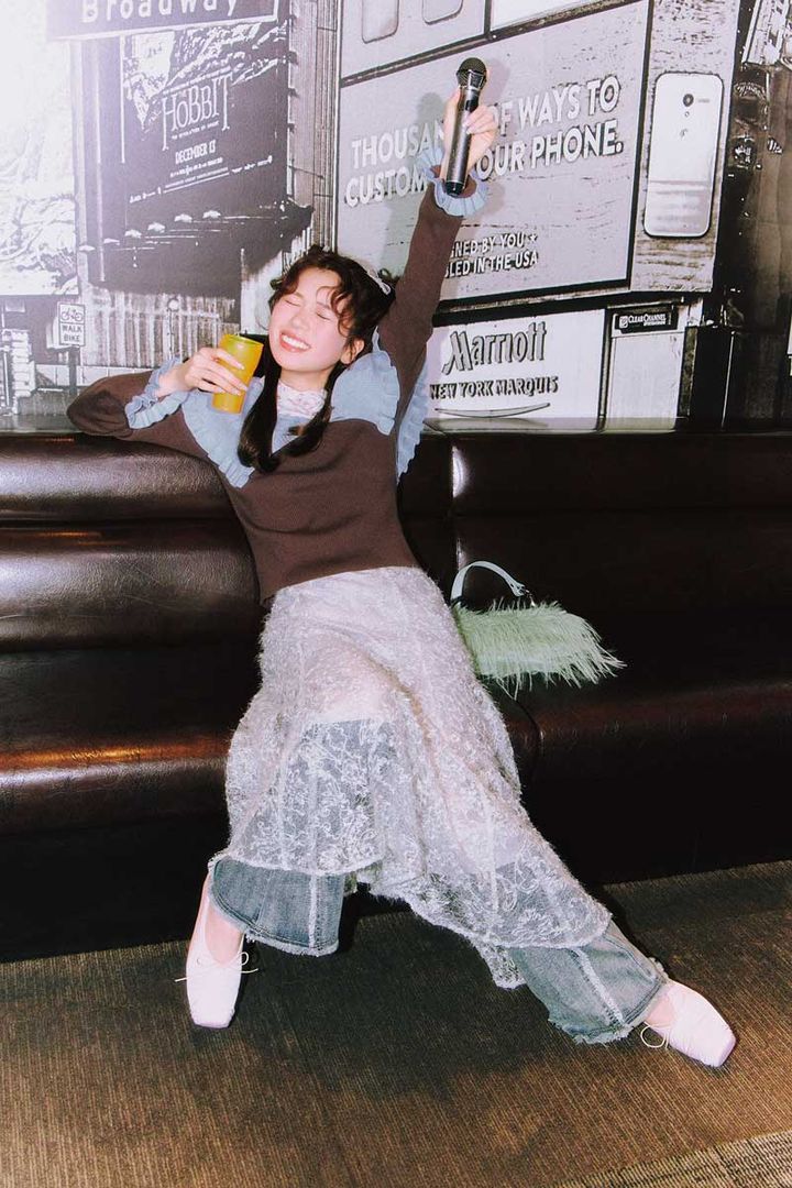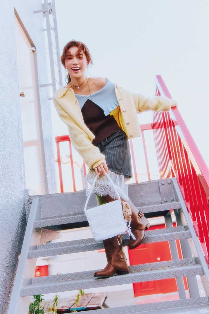 審良ふたば。ar1月号より オフショルニット¥6,270/ヘイレーン(アンティローザ) ローズブローチ付きシャツ¥17,600/ガールズソサエティ デニム¥4,387/スピンズ スカート¥20,800 /スナイデル(スナイデル ルミネ新宿2店)