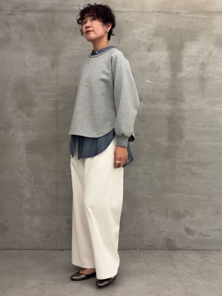 トップスには、ライトグレーのダンボールカットソーを着用。インナーにはガーゼのような素材の、ネイビーのシフォンブラウスをレイヤードし、軽やかさも加わっています。