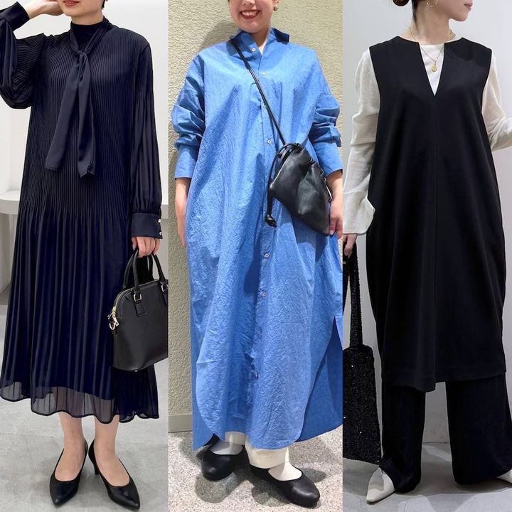 単体でも上品なキーネックのシンプルなワンピースは、インナーにブラウスを合わせてオケージョン着に。ニットやカットソーを合わせて普段使いにと、ロングシーズン着回せます。こちらの着こなしのように、ボトムスにパンツをレイヤードしてもいいですね。