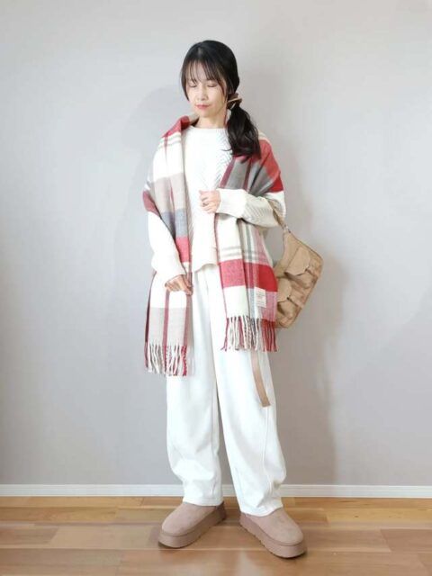 ホワイトのワントーンコーデはクリーンな印象に決まり、カジュアルなスウェットパンツを合わせてもラフになりすぎません。お出かけするときはアクセントをプラス。チェック柄のストールや白以外のアウターを合わせて奥行きのあるコーデに仕上げましょう。
