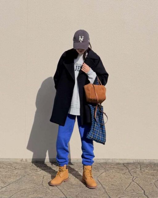 ブルーのスウェットパンツ×違う色のスウェットで配色を変える!